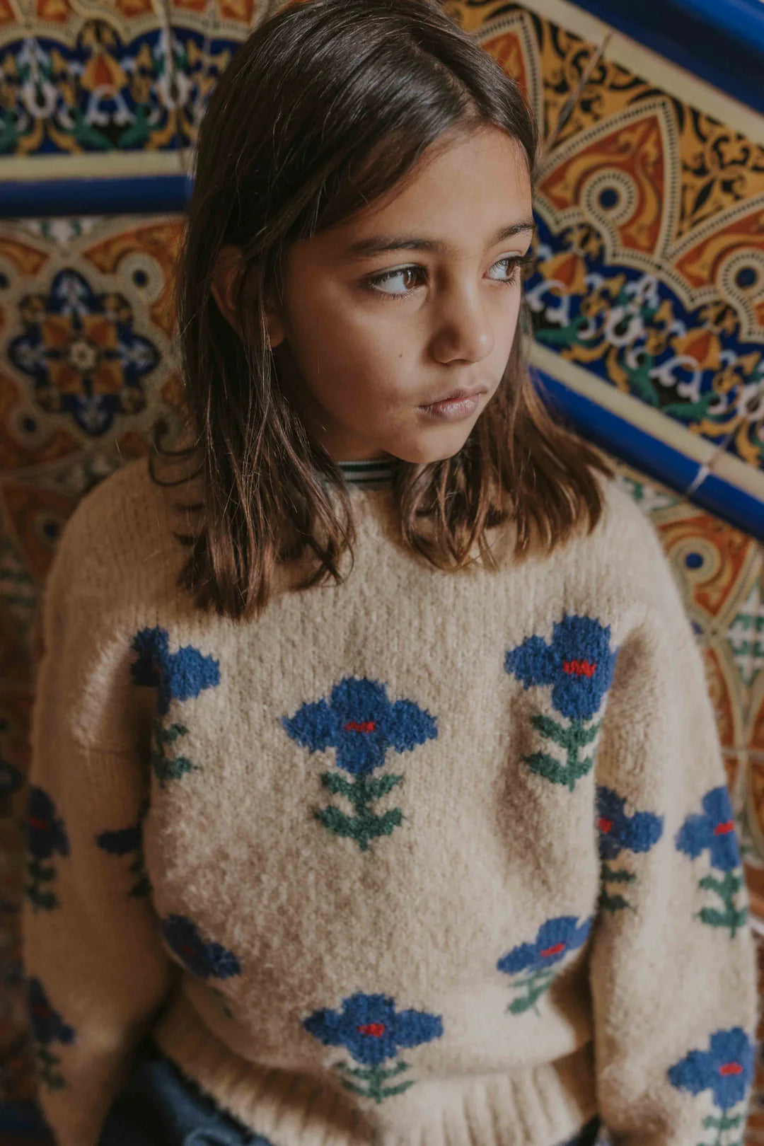 This super soft knitted sweater from A MONDAY in Copenhagen boasts a hand-knitted appearance, crafted from 50% wool and 50% polyester. Featuring a round neck, wide sleeves, and an oversized fit with ribbed detailing, it’s adorned with flower artwork—perfect for cozy days.