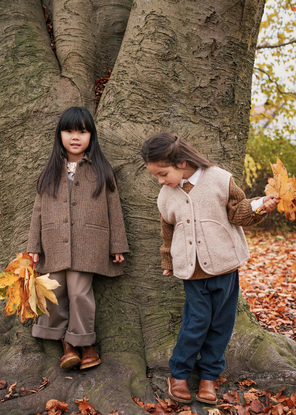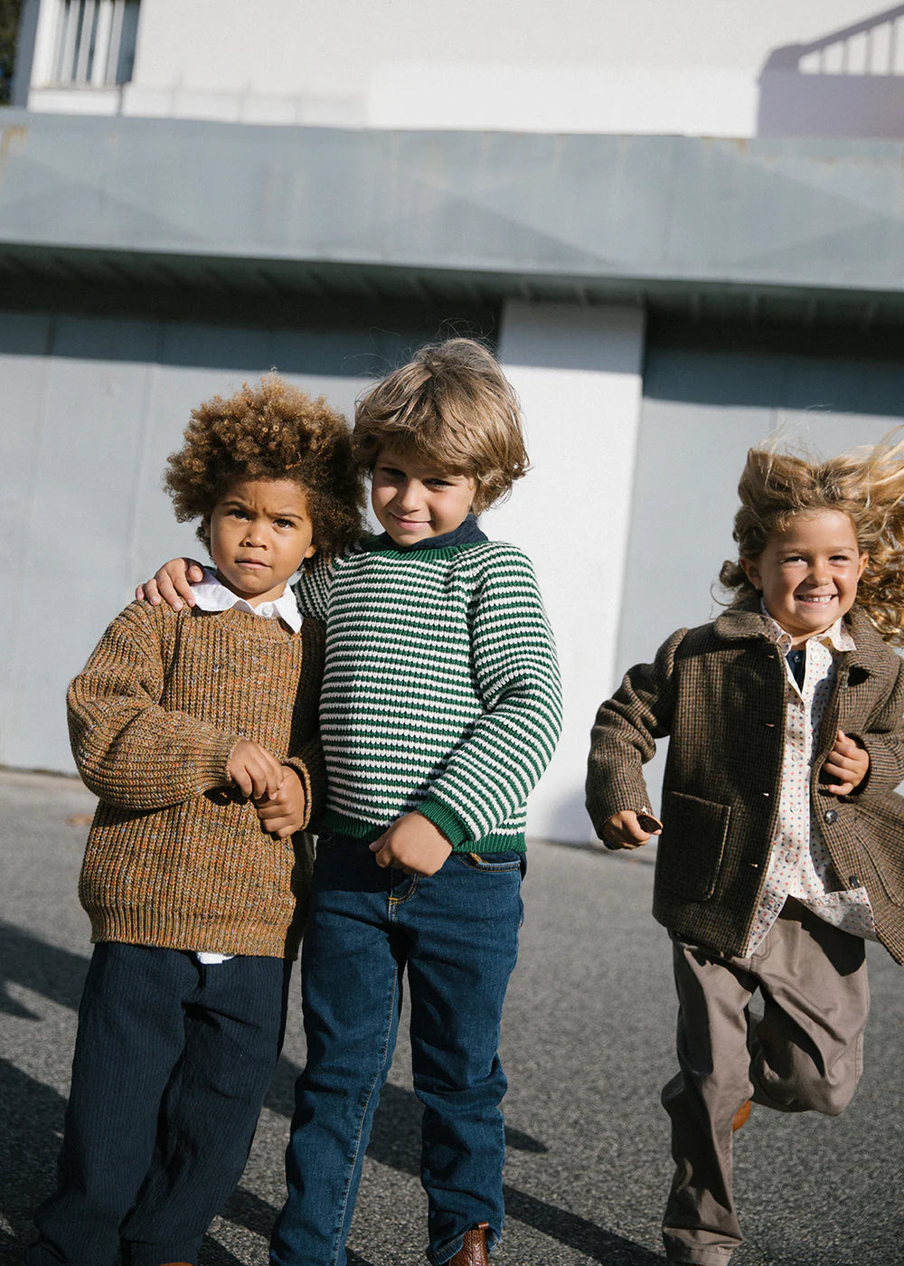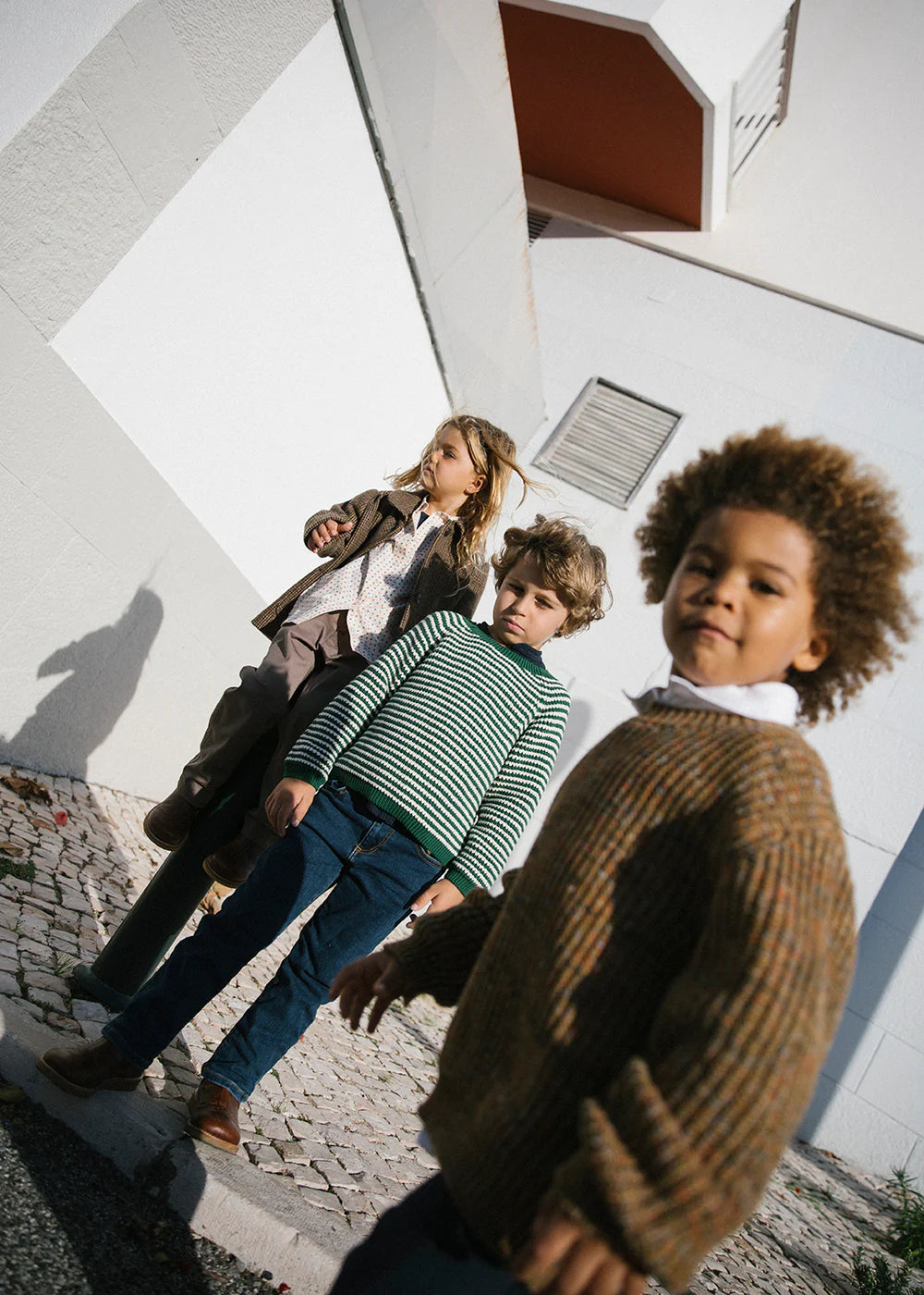 The Teno Space-Dye Knitwear from MarMar Copenhagen is a classic ribbed sweater in dark bronze melange yarn. With its chunky design, round neck, and long sleeves, it offers both warmth and comfort. Crafted from a soft cotton blend, this timeless piece is perfect for boys in cooler seasons.